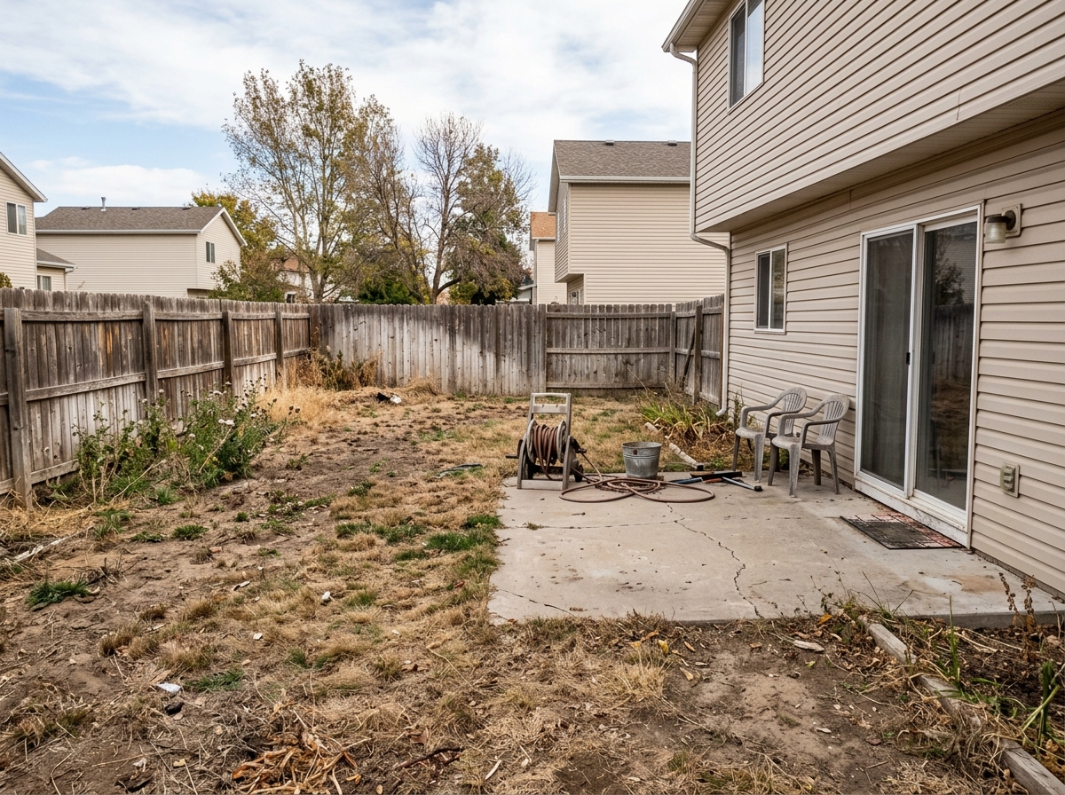 Drag the slider to compare • Same house, same fence—just the landscaping transformed