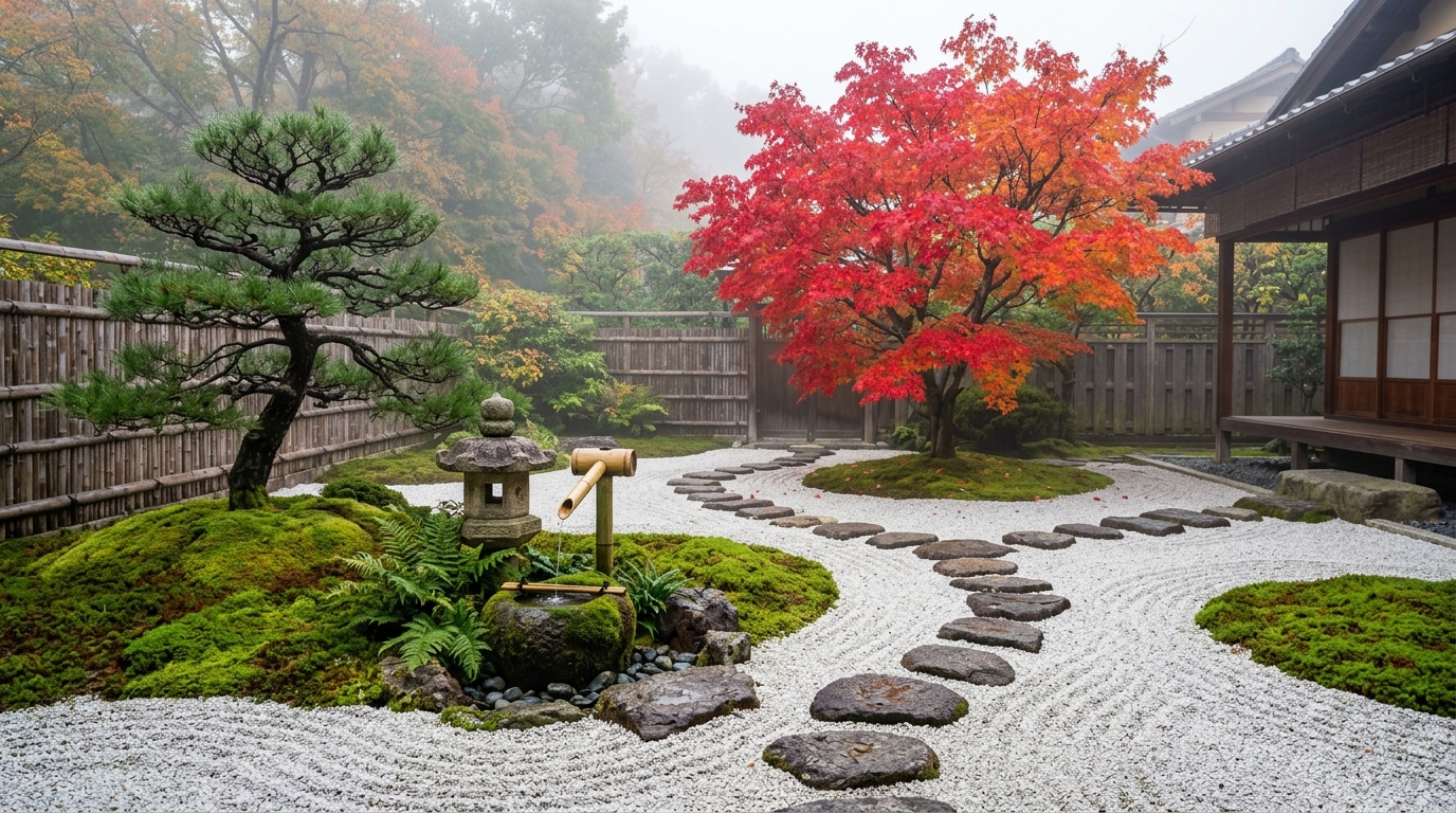 Raked gravelJapanese mapleStone lanternBamboo water feature