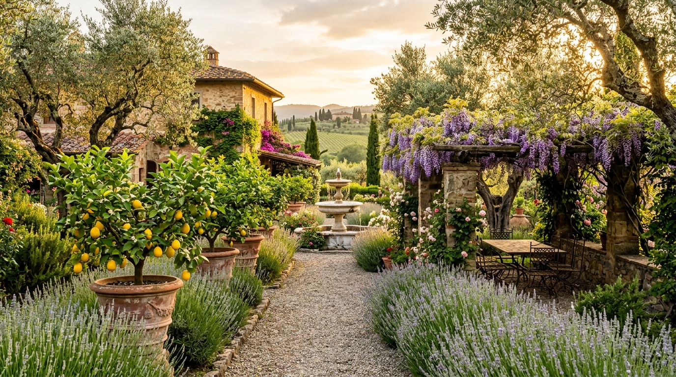 Terracotta urnsOlive treesWisteria pergolaStone fountain