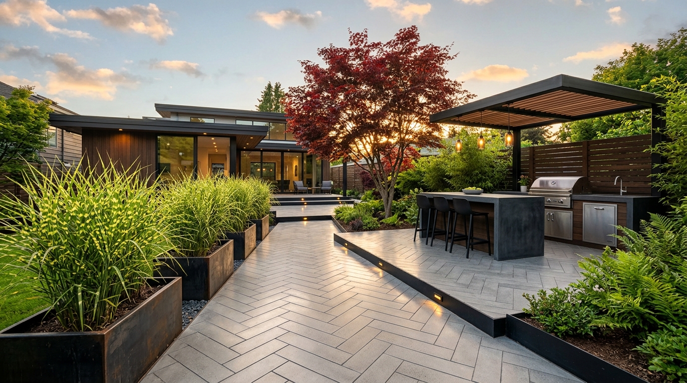 Concrete paversOrnamental grassesLED path lightingOutdoor kitchen