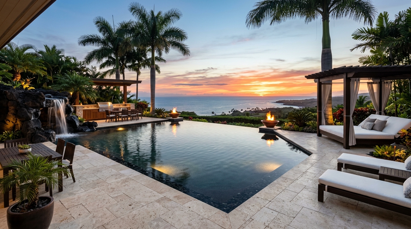 Infinity poolTravertine deckTropical plantingsFire bowls
